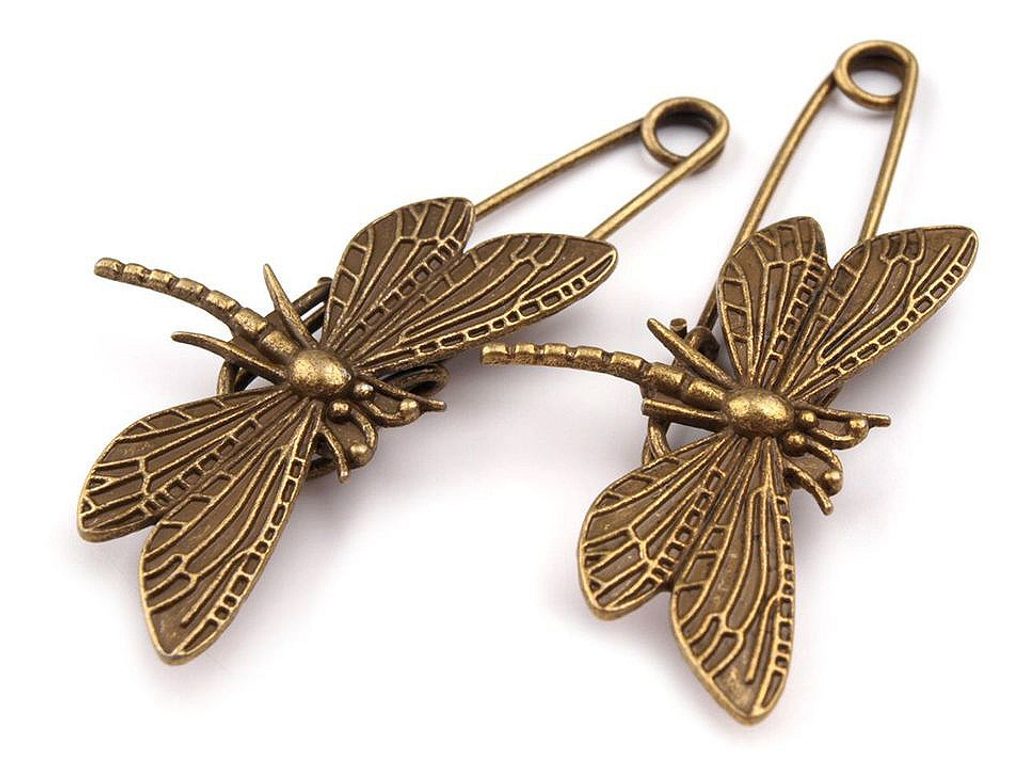 Zajímavá brož ve tvaru vážky na spínacím špendlíku. [Motiv malého motýlka je decentní, dobře se kombinuje s širokou řadou oděvů. Podtrhne vaši krásu a eleganci. Brože jsou vyrobené z pevného kovu. Špendlík je vhodný pro silnější materiály jako jsou svetry, saka, klobouky, tašky apod. Nehodí se na světlé materiály, protože špička špendlíku může lehce barvit.]