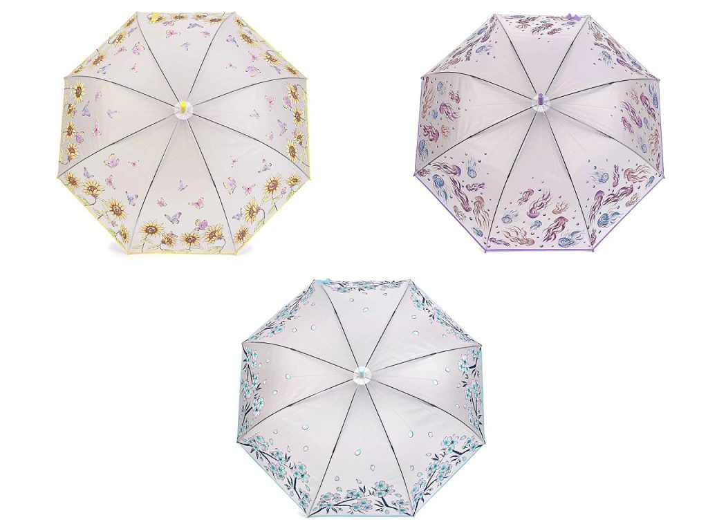 Průsvitný deštník s barevným potiskem bude slušet dívkám i ženám. Deštník je vystřelovací, konstrukci má z kovového drátu a pružných lamel, tvoří osm polí. Díky nim je velice pevný, neohne se ani za největšího nečasu. Klasická tyč je zakončená pevnou rukojetí.