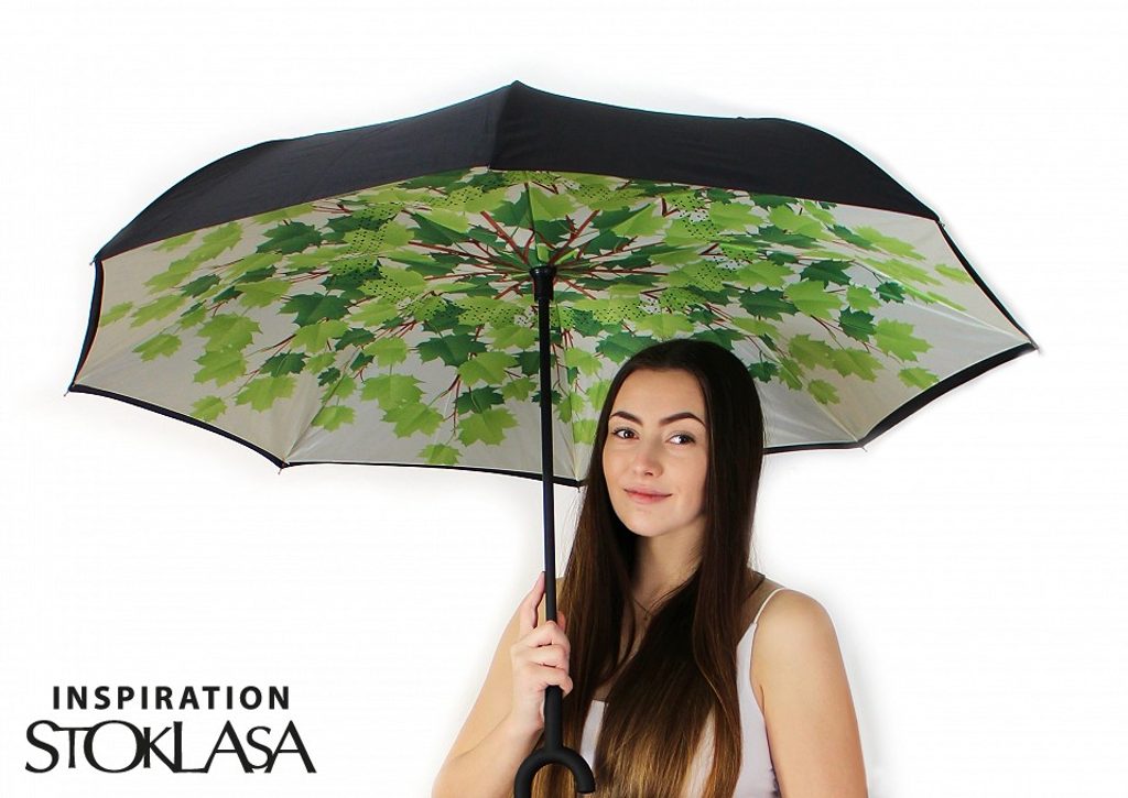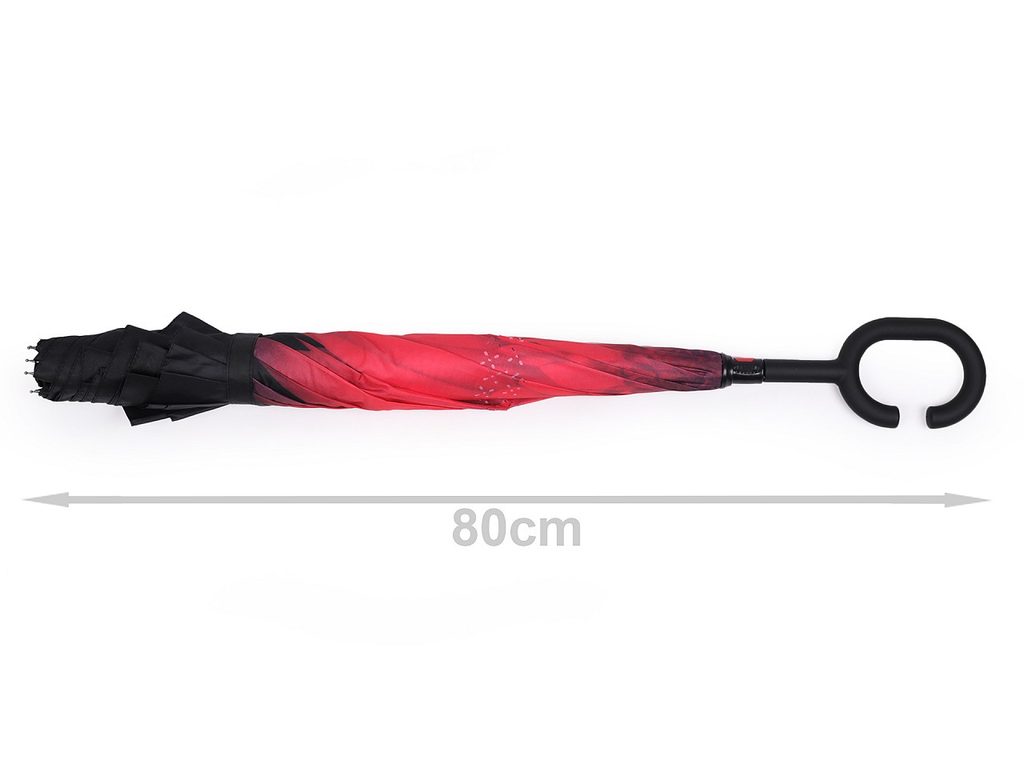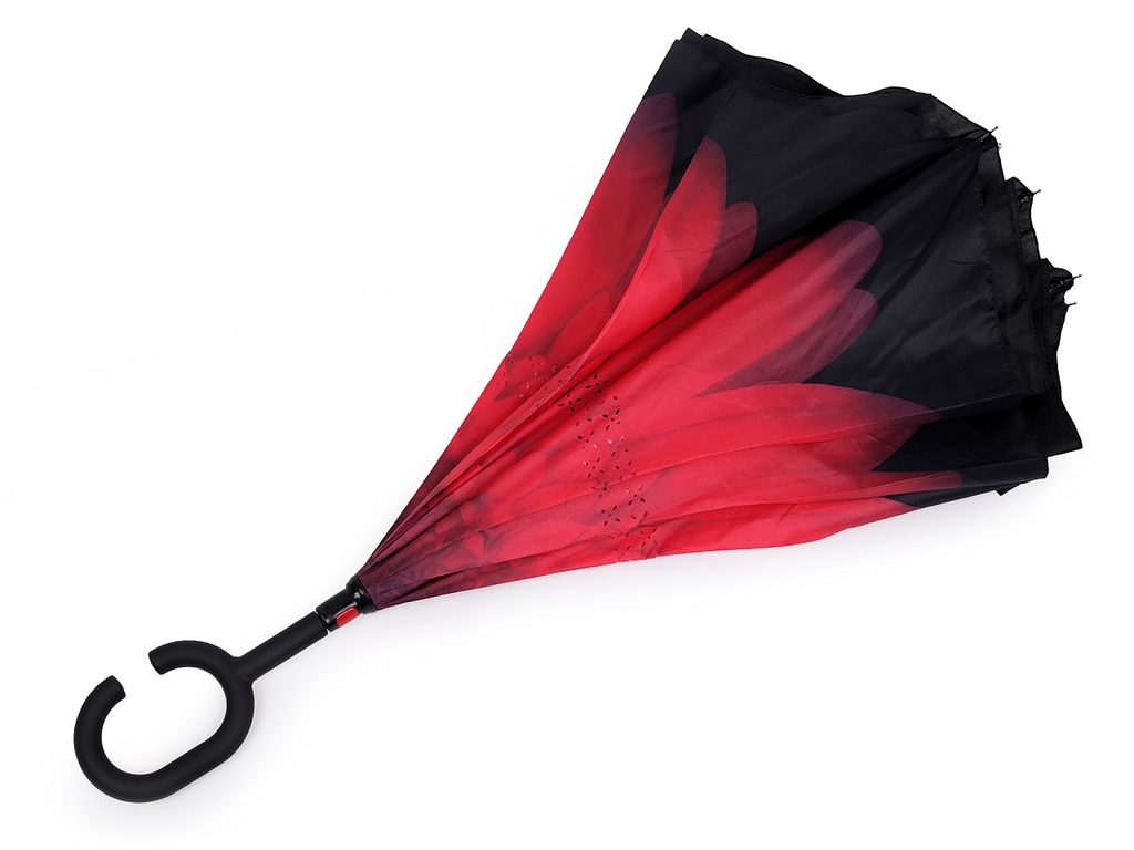 Obrácený deštník s barevným vnitřním potahem má revoluční řešení konstrukce. Díky opačnému otevírání a zavírání deštníku směrem vzhůru voda zůstane schovaná uvnitř v deštníku. Je to veliká výhoda např. když usedáte do automobilu, voda na vás již při zavírání nesteče, ale zůstane v deštníku. Jistě oceníte i jeho praktické sušení. Deštník sám stojí, stačí jej postavit na vhodné místo a voda sama steče ven, deštník už nemusíte rozevírat. Rukojeť ve tvaru C umožňuje deštník zaháknout přímo na paži, vaše ruce zůstanou volné např. k telefonování.