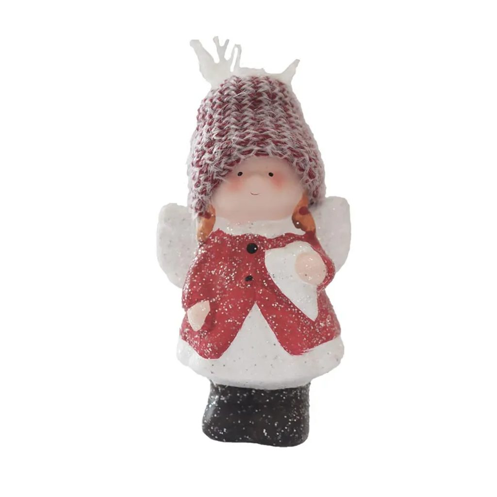 Dekorační anděl. Rozměry : 7 x 5,2 cm, výška 11,7 cm. Barva : kombinace červení s bílou. Materiál : keramika, textil.