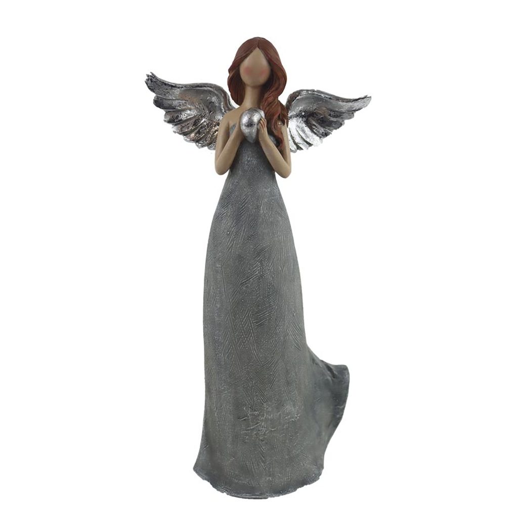 Dekorační anděl. Rozměry : 12,5 × 7 cm, výška 26 cm. Barva : kombinace šedá, stříbrná. Materiál : polyresin.