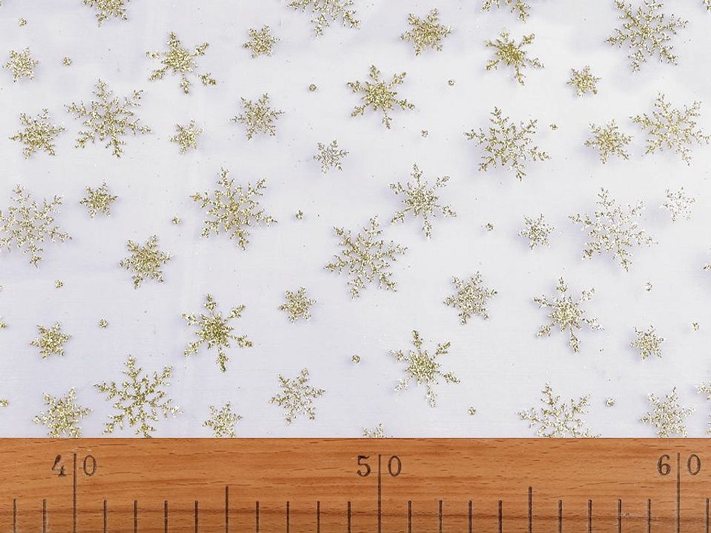 Organza s glitrovými vločkami je vhodná k dekoračním účelům. Využijete ji k vánočnímu aranžování, ozdobení slavnostní tabule, k balení dárků i k výrobě andělů.