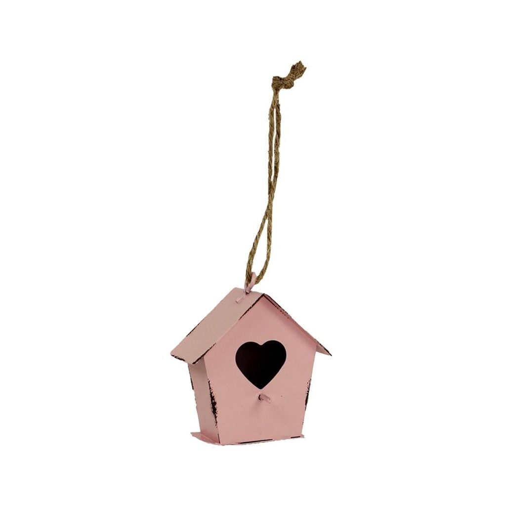 Dekorační budka k zavěšení. Rozměry : 5 x 2,5 cm, výška 6 cm. Barva : růžová. Materiál : kov.