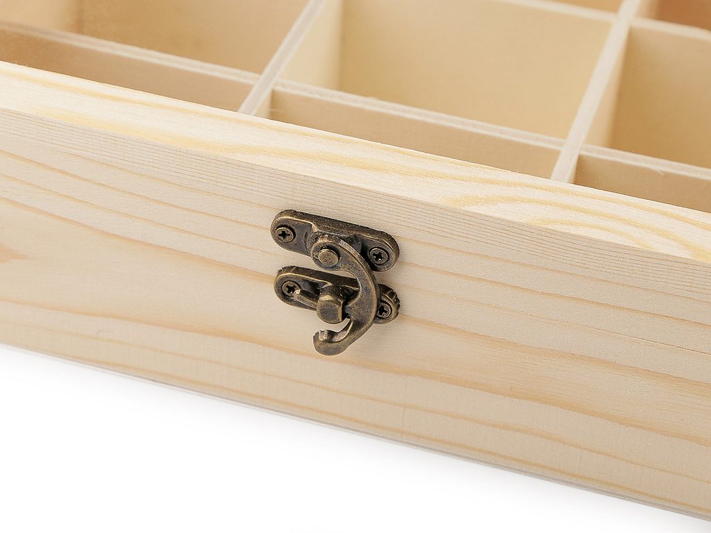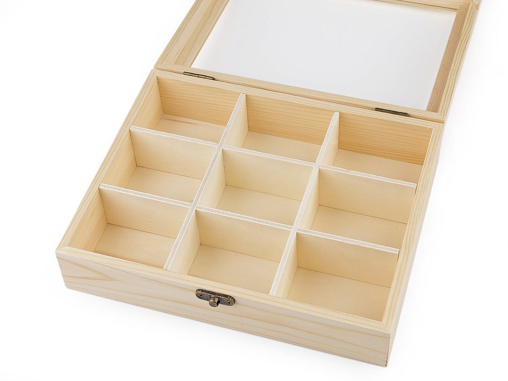 Dřevěná krabička se skleněný průhledným víkem se hodí na uložení drobného materiálu na vaše kreativní tvoření. Víko je odklápěcí, s kovovým zapínáním a panty. Hodí se na korálky, knoflíky, bižuterní materiál apod. Najde využití i jako stylový organizér v domácnosti, do skříně, šuplíku apod. Vejdou se do ní náramky, gumičky, sponky apod. Je oblíbená i sběrateli drahých kamenů a minerálů.