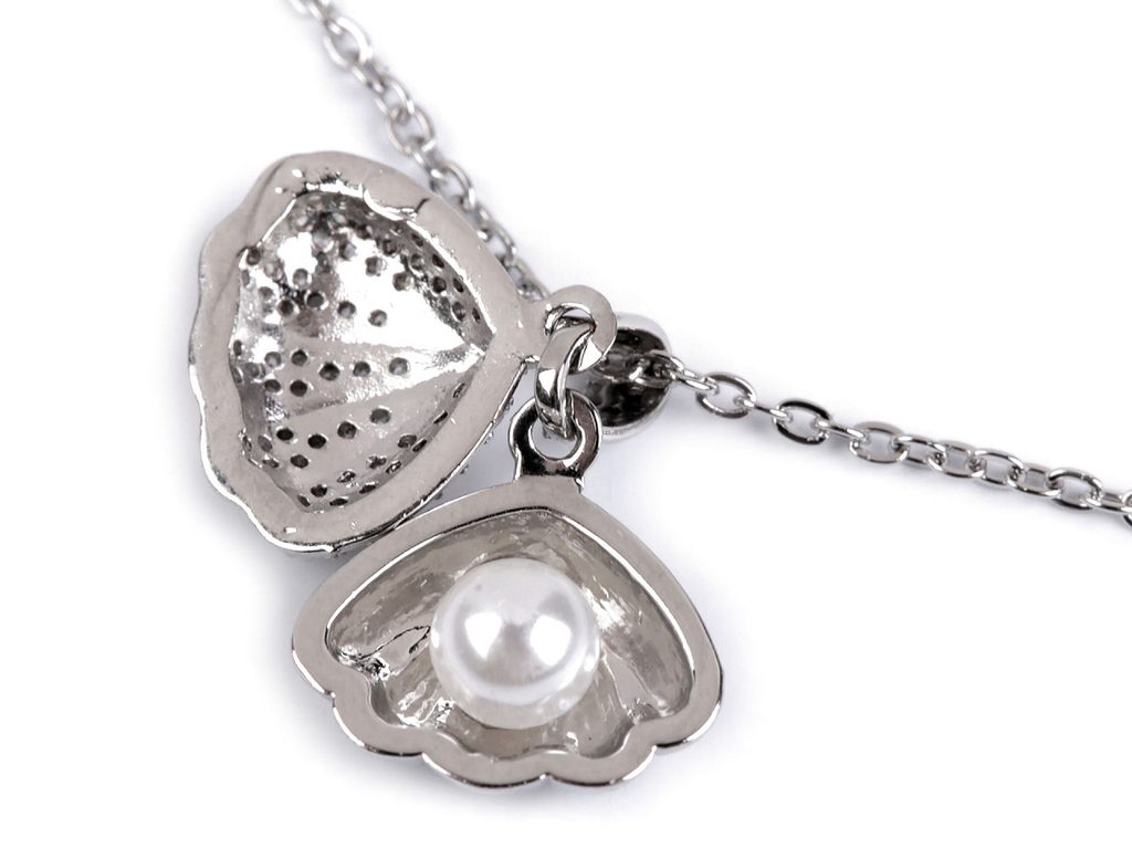 Řetízkový náhrdelník s přívěskem mušle s perlou je elegantní šperk, který zaujme svou jemnou estetikou. Je stylovým doplňkem pro každou příležitost, skvěle ladí s letními šaty na plážovou party i s elegantním večerním oblečením. Je vyrobený z kvalitní nerezové oceli. Přívěsek se jemně třpytí, je složený ze dvou dílů, horního a dolního, po otevření mušle je vidět perla schovaná uvnitř. Mušle je zavěšená na šlupně, volně se na řetízku pohybuje.