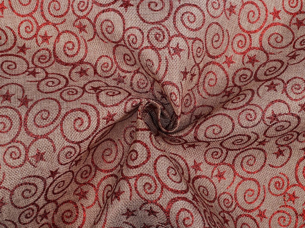 Imitaci juty zdobí glitrový potisk s ornamenty. Využijete ji především k dekoračním účelům - na šití pytlíčků, ubrusů, prostírání nebo běhounů či ke zdobení truhlíků, květináčů apod.