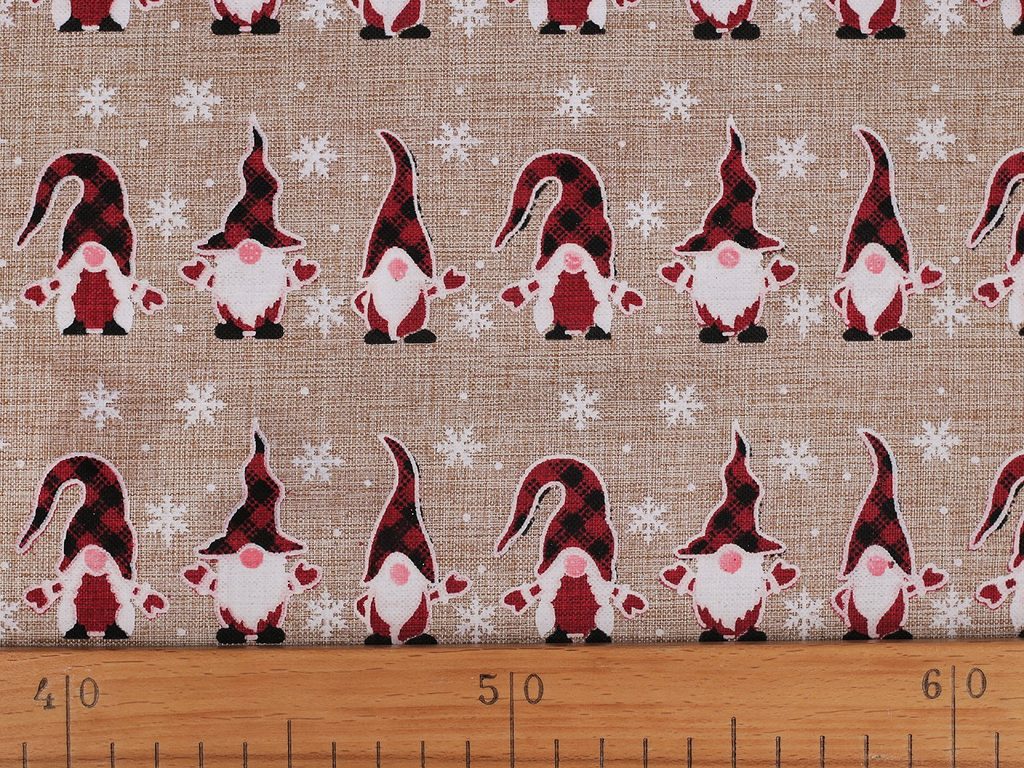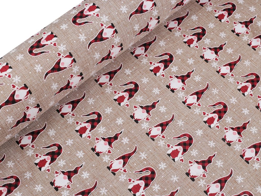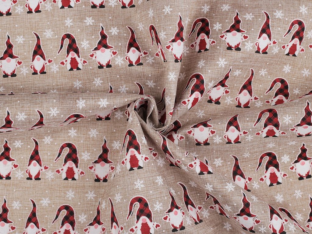 Imitaci juty zdobí potisk roztomilých vánočních skřítků. Využijete ji k dekoračním účelům - na šití pytlíčků, ubrusů, prostírání nebo běhounů či ke zdobení truhlíků, květináčů apod.