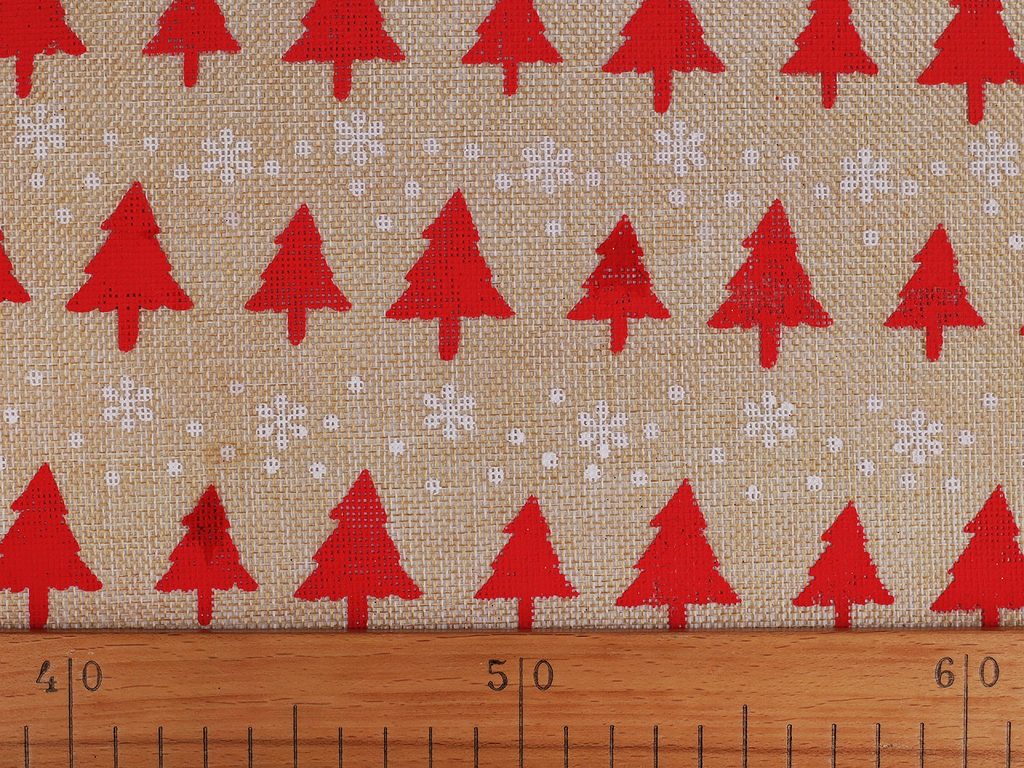 Imitaci juty zdobí potisk stromečků a sněhových vloček. Je lehká a pevná. Využijete ji na šití pytlíčků, ubrusů, prostírání nebo běhounů.