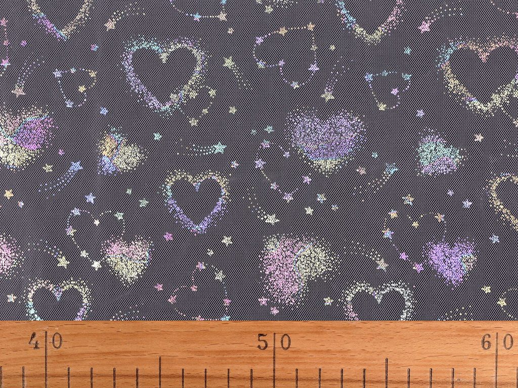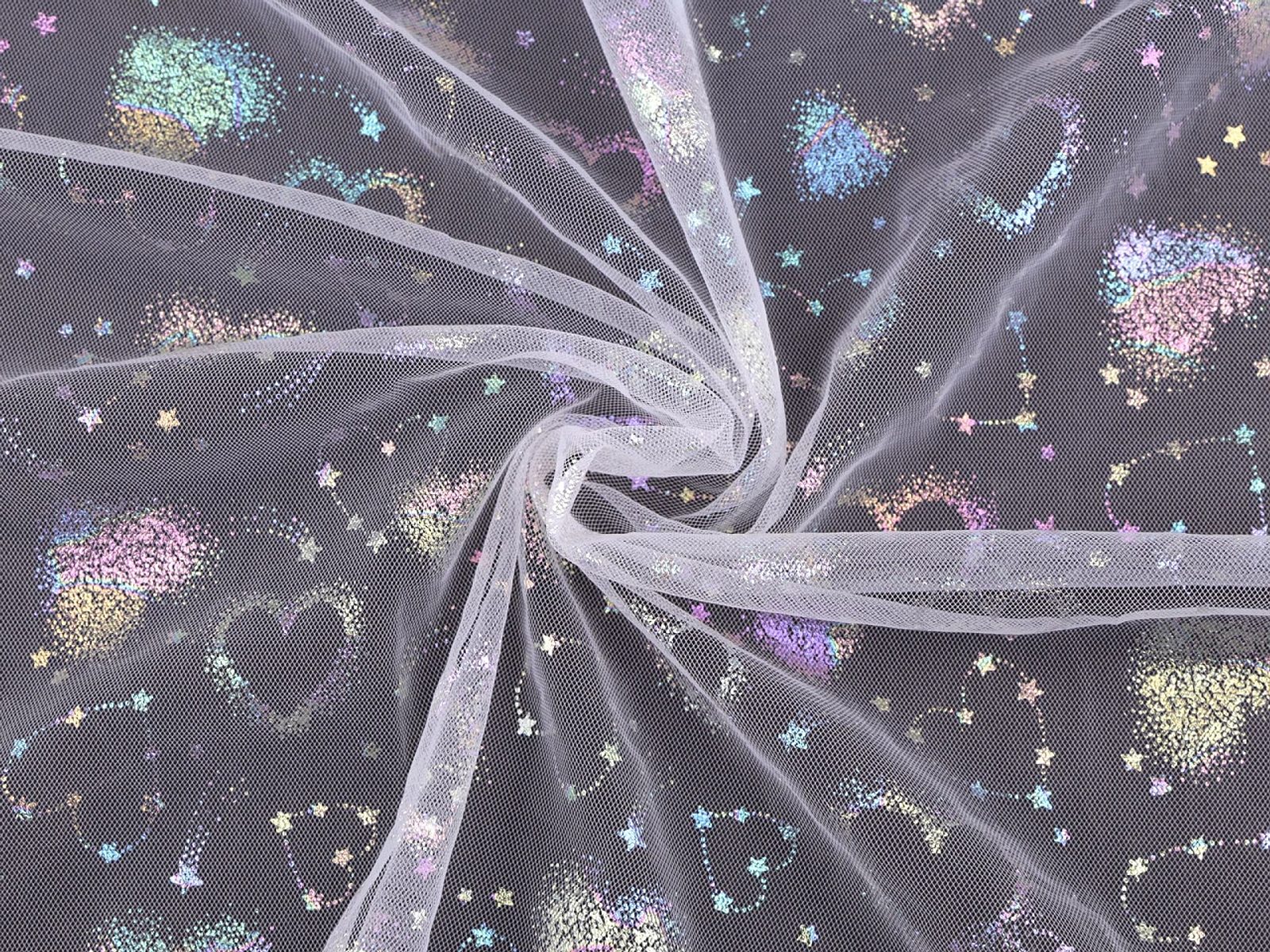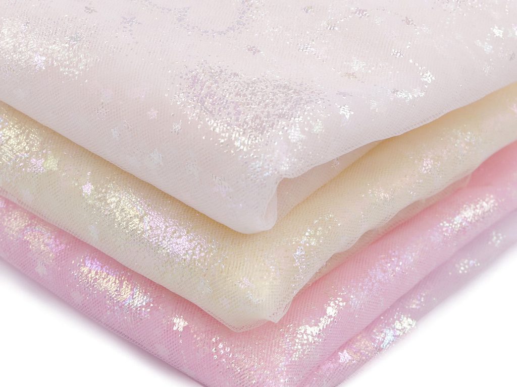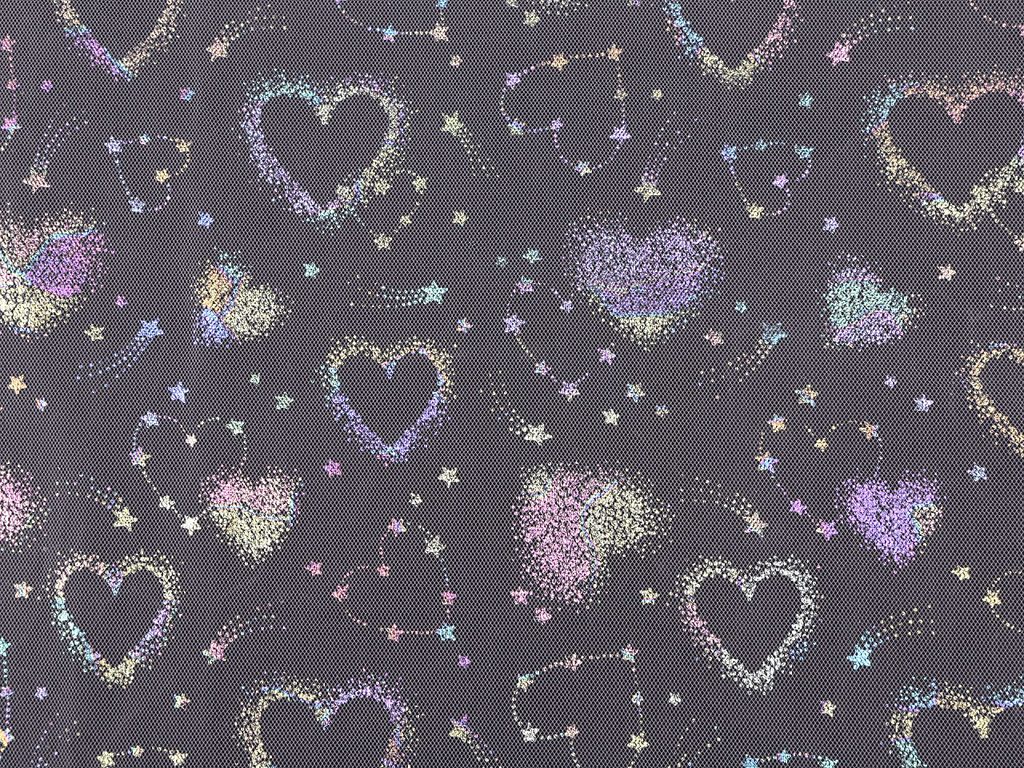 Jemný tyl zdobí potisk srdíček a drobných hvězdiček s AB efektem. Je měkký, elastický, ovšem po šíři pruží víc.