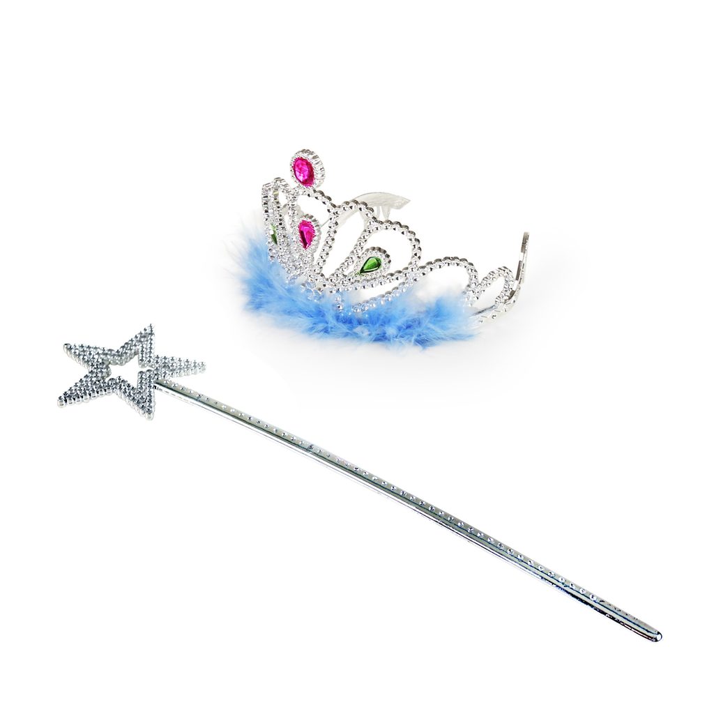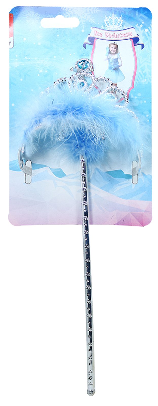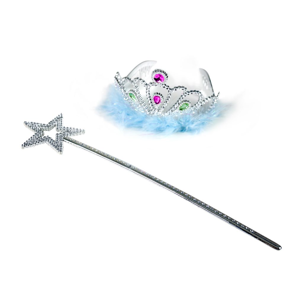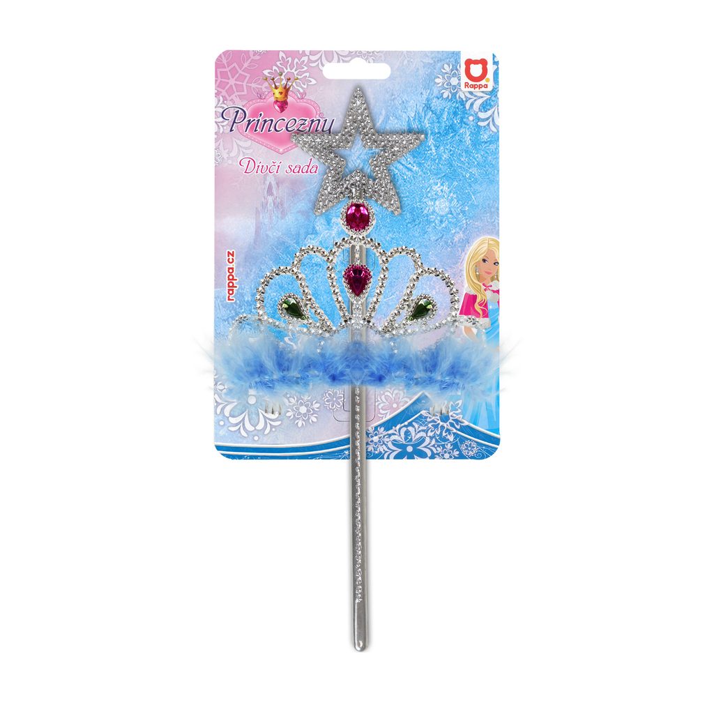 Sada pro sněhové princezny. Korunka je zdobena modrými prvky a společně s hůlkou je dekorována blankytně modrým peřím. Perfektní doplňky ke kostýmu sněhové princezny!