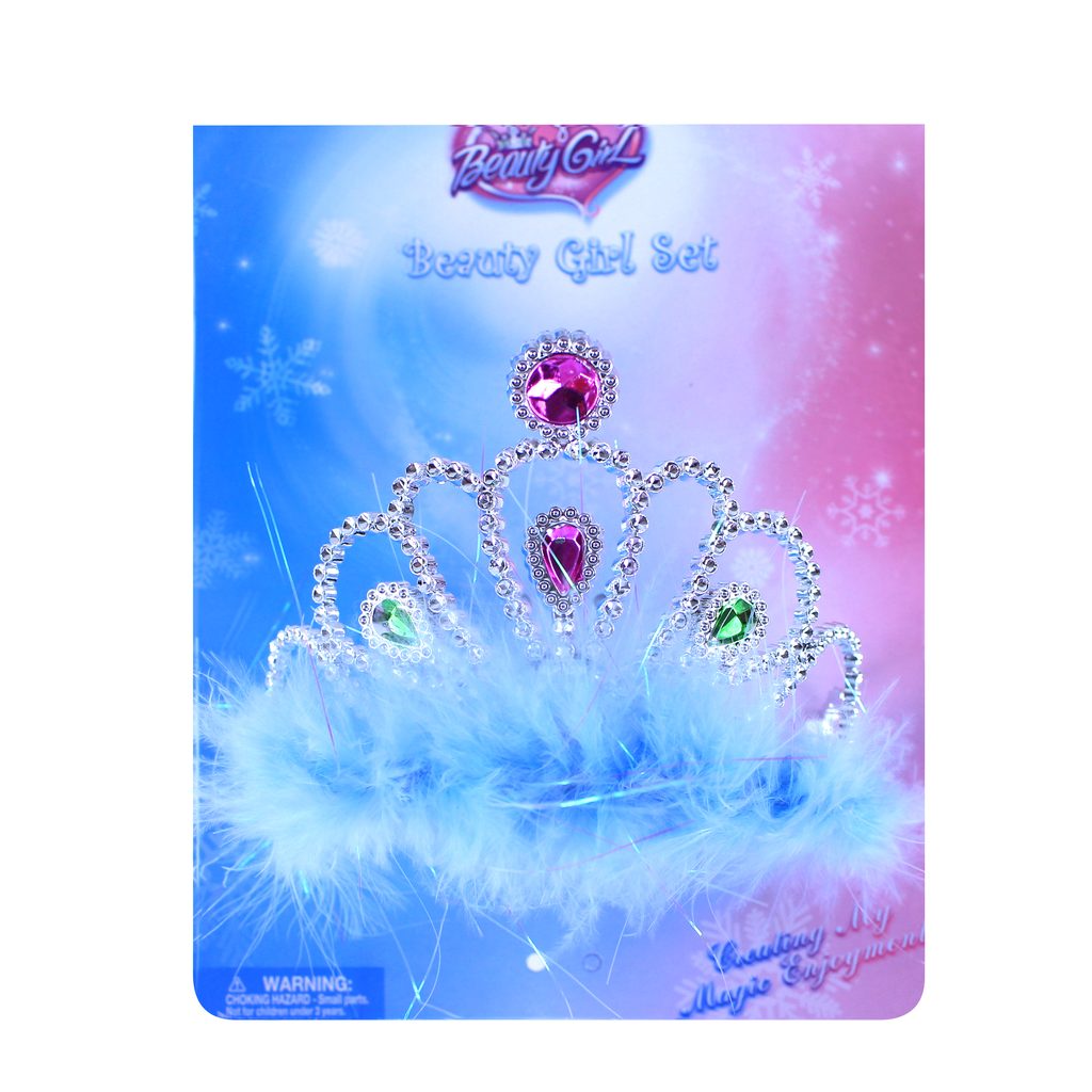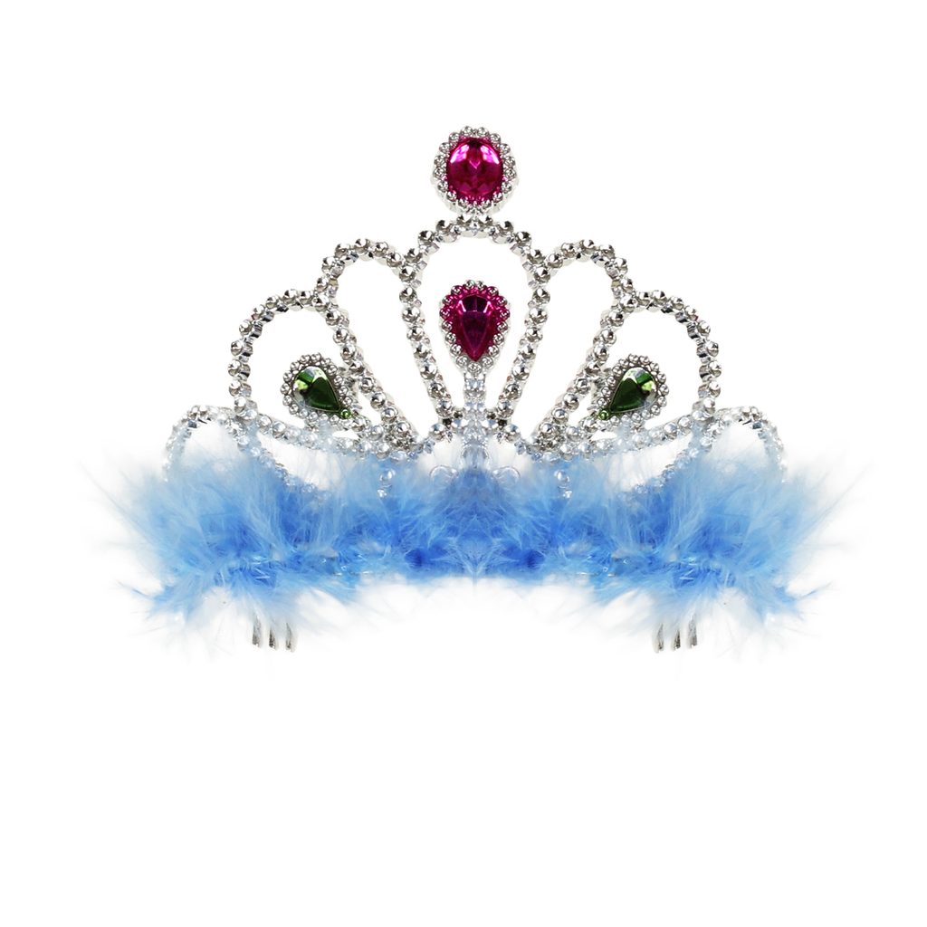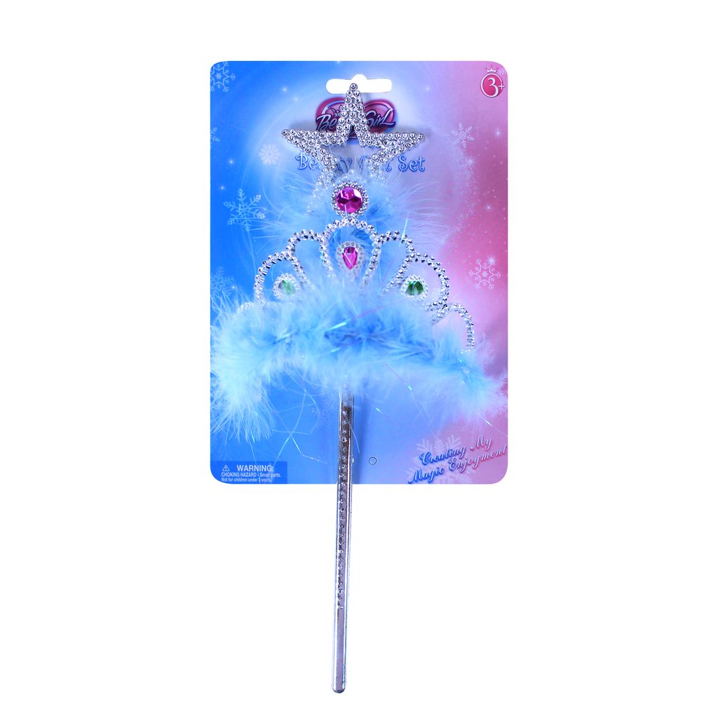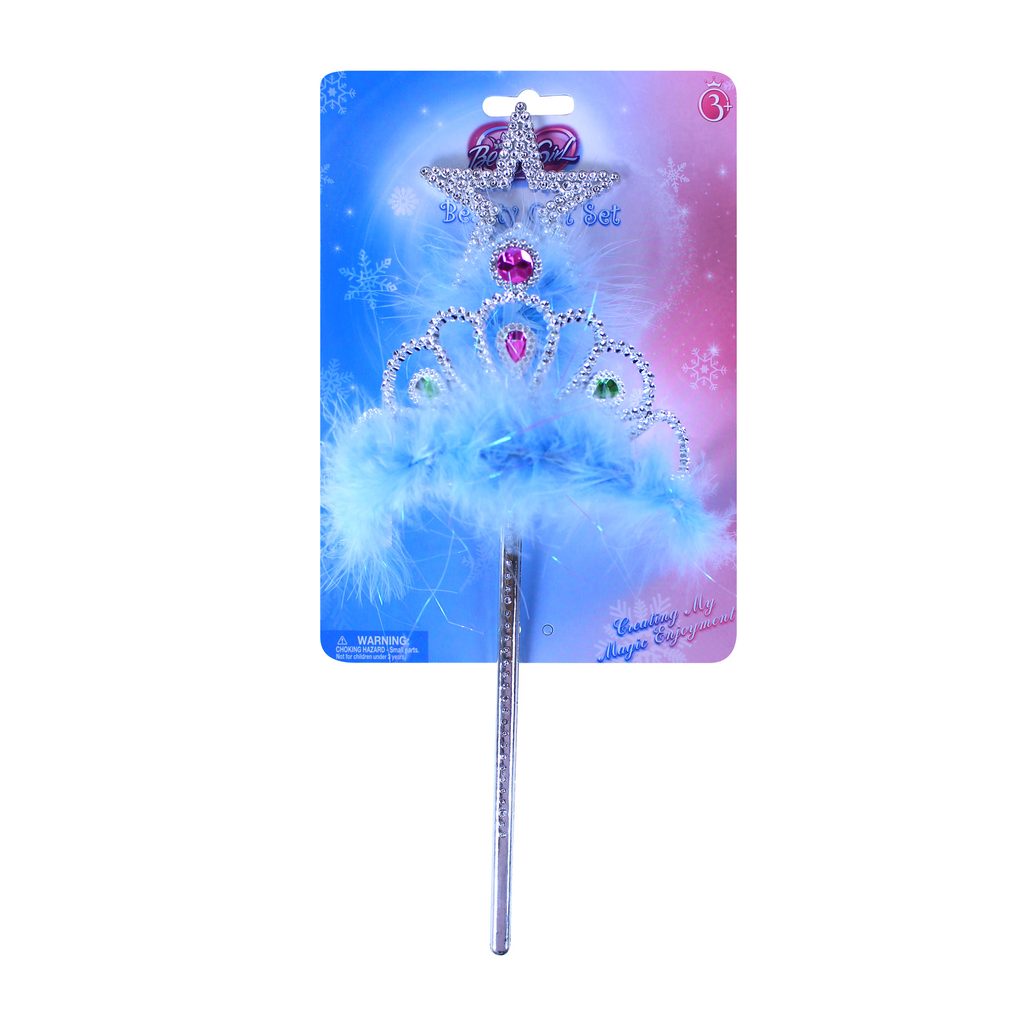 Sada pro sněhové princezny. Korunka je zdobena modrými prvky a společně s hůlkou je dekorována blankytně modrým peřím. Perfektní doplňky ke kostýmu sněhové princezny!