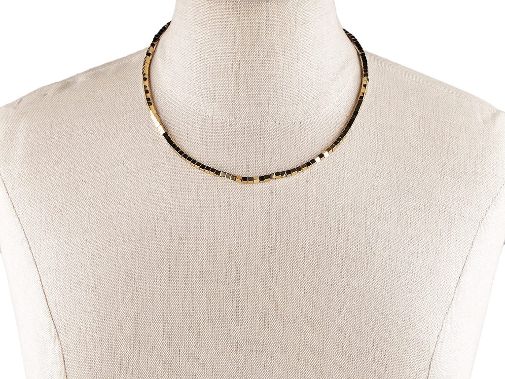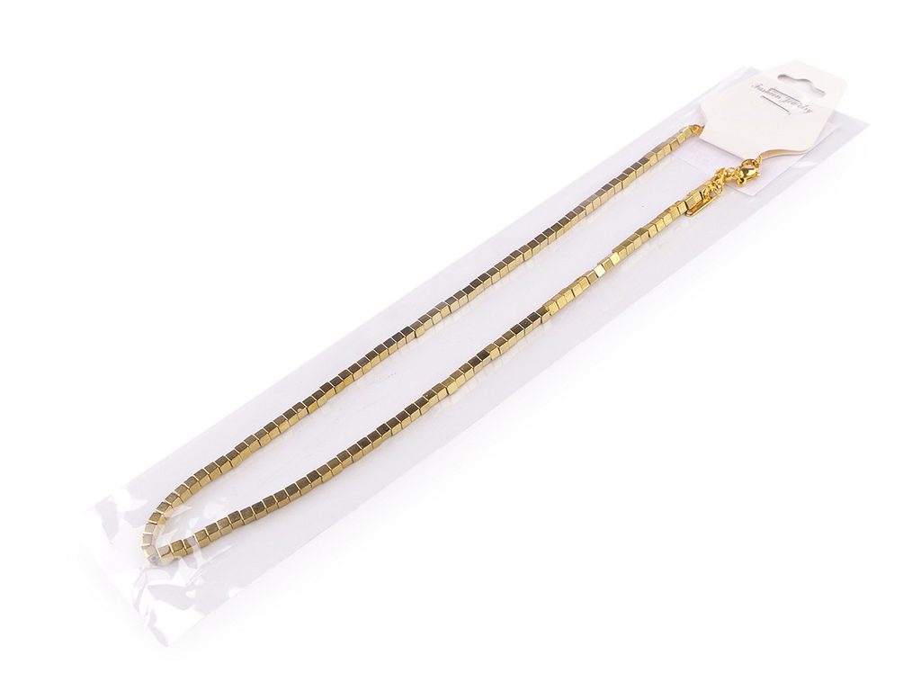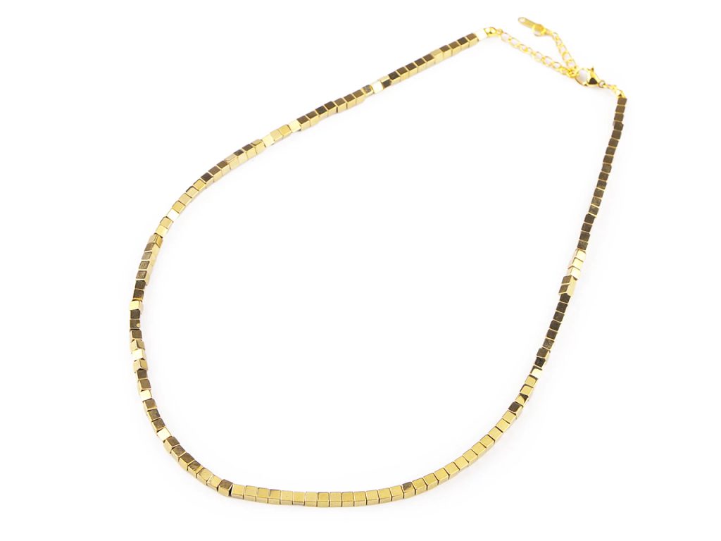 Poutavý náhrdelník vyrobený z kostiček pokoveného hematitu a kvalitní nerezové oceli je velice elegantní, patří mezi šperky, které díky své fascinující povrchové úpravě zaujmou na první pohled.