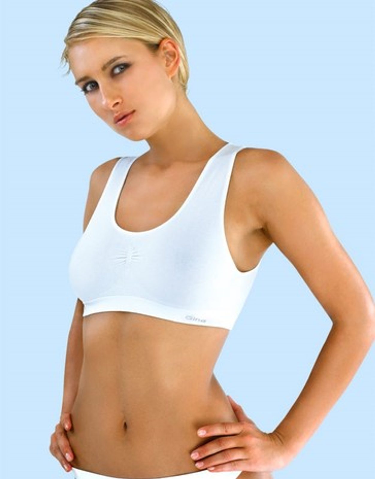 Podprsenky Gina nakúpite v bielej, čiernej aj telovej farbe - dámske topy, ktoré Vám podrží pri športe menšie poprsie. Pre väčšie a pevnejšie prsia odporúčame na šport značku Litex, alebo Winner.