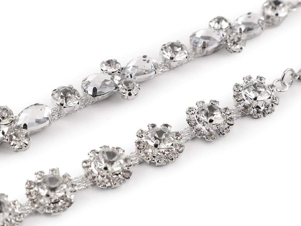 Štrasová ozdoba má na obou koncích mini karabinky umožňující snadné připevnění k materiálu. Můžete ji připnout na oděvy i doplňky, např. plesové šaty, halenky, saka, psaníčka, kabelky, čelenky i boty. Ozdoba působí luxusně a elegantně.