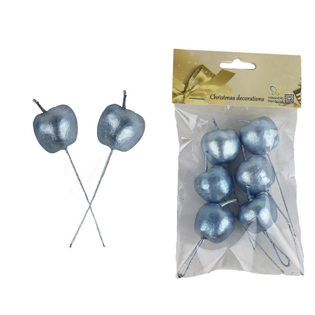 Sada dekoračních jablíček. Sada obsahuje 6 jablíček. Rozměry : průměr 3 cm, výška 3,5 cm, celková délka zápichu 10,5 cm. Barva : modrá. Materiál : plast.