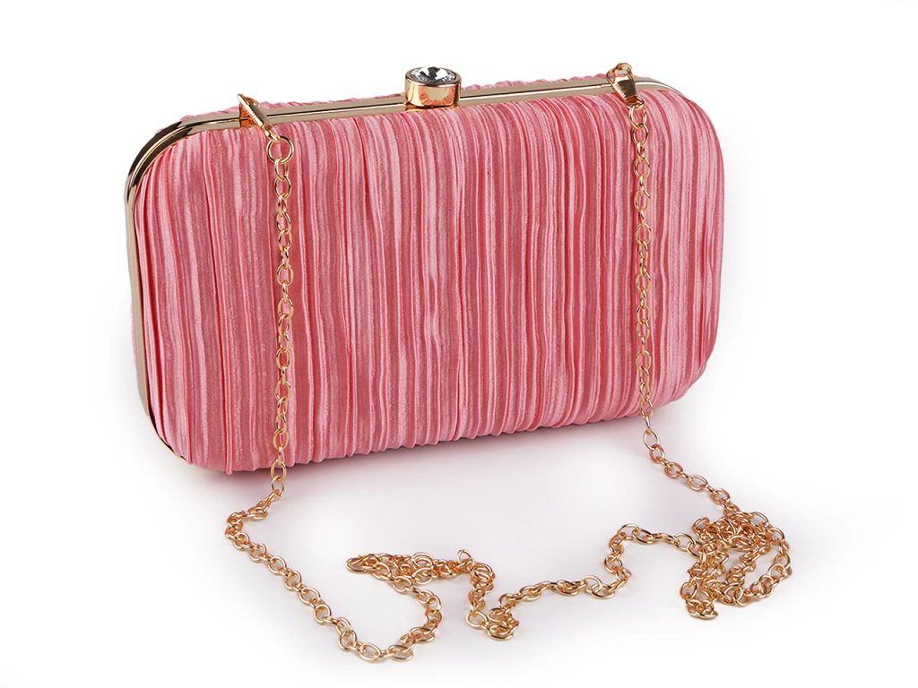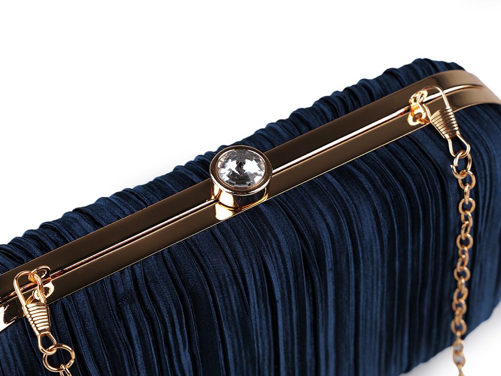 Luxusní společenská kabelka je skvělým doplňkem pro každou příležitost, kdy chcete vypadat stylově a elegantně. Zdobí ji textilní nařasený povrch s jemným leskem a výrazné lesklé zapínání ve tvaru vsazeného broušeného kamene. Kabelka je pevně vyztužená, skořepinová, po celém obvodu má kovový rámeček. Její součástí je dlouhý odnímatelný řetízek na karabiny. Můžete ji nosit v ruce nebo jako crossbody přes rameno či do kříže.