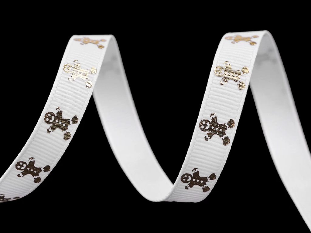 Vánoční dekorační rypsová stuha s metalickým potiskem perníčků je velice kvalitní. Na povrchu má typické jemné žebrování. Potisk je jednostranný.