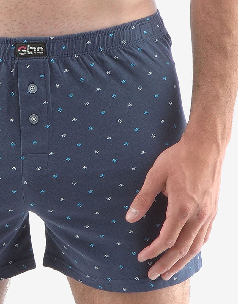 Tento kousek má drobný celoplošný vzor - potisk šipek, v pase nášivku s logem Gino. Dobře padnoucí pasová guma a rozparek na dva knoflíky jsou samozřejmostí.