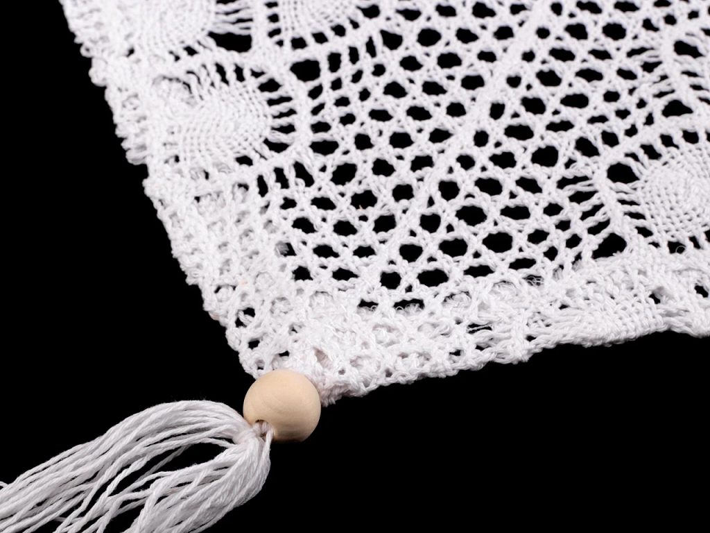 Běhoun z paličkované krajky poslouží k ozdobení středové části stolu. Využijete ho nejen doma, ale i na svatbách a různých oslavách ve vintage nebo boho stylu. Kratší strany má zakončené střapcem a dřeveným korálkem.