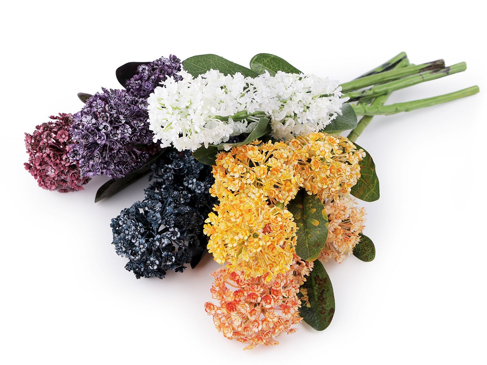 Umělý okrasný česnek zdobí tři kulaté hlavičky květů a textilní listy. Využijete ho na dekorační vazby, ikebany apod., ale vynikne také jednoduše položený ve váze.