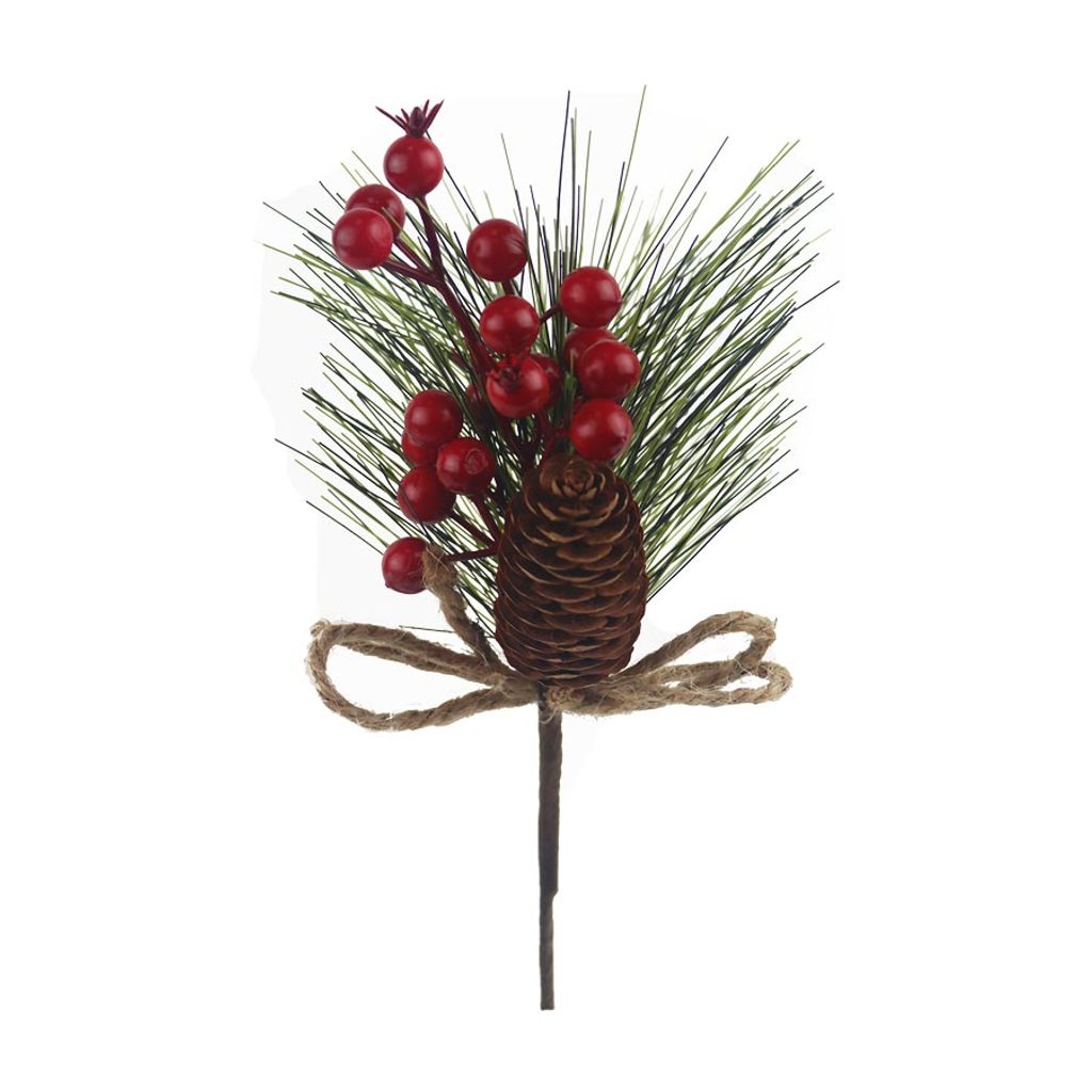 Dekorační větvička. Rozměry : 10 x 8 cm, celková délka 24 cm. Barva : kombinace zelená, hnědá, červená. Materiál : plast.