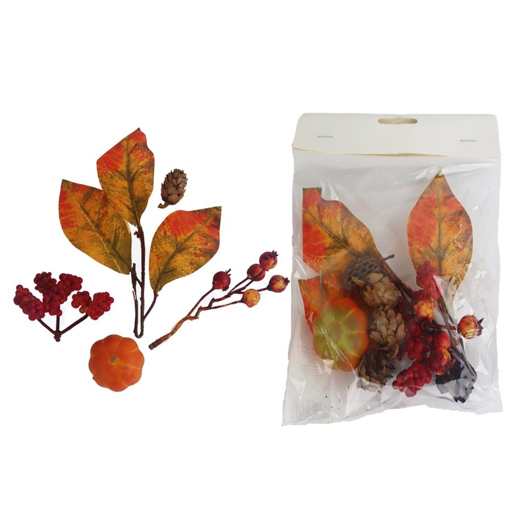 Dekorační podzimní větvička. Rozměry : 2 - 12 x 2 - 4 cm, výška 3 - 16 cm. Barva : kombinace oranžová, hnědá. Materiál : plast.