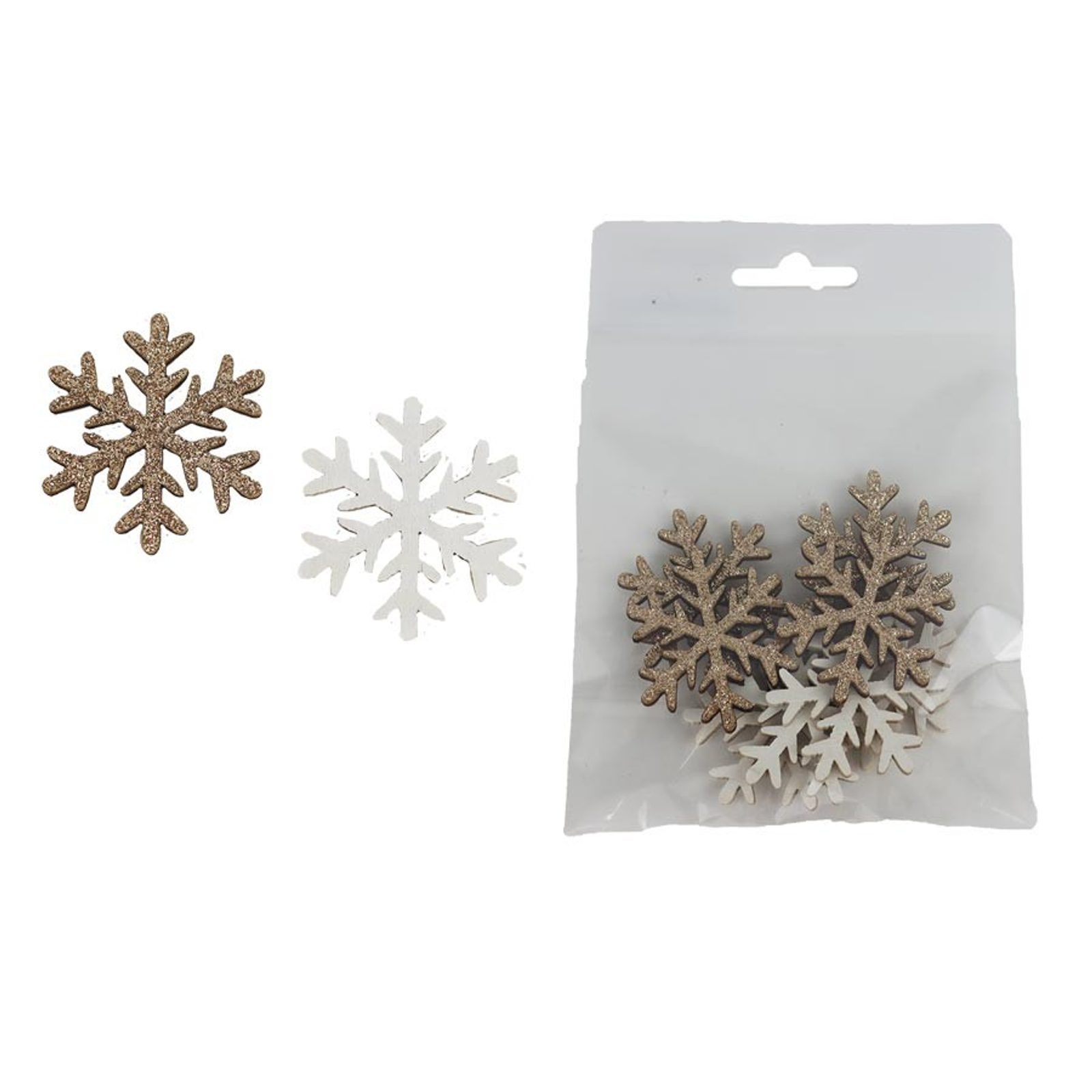 Sada dekoračních vloček. Sada obsahuje 8 vloček. Rozměry : průměr 4 cm, tloušťka 0,2 cm. Barva : kombinace zlatá, bílá. Materiál na bázi dřeva.