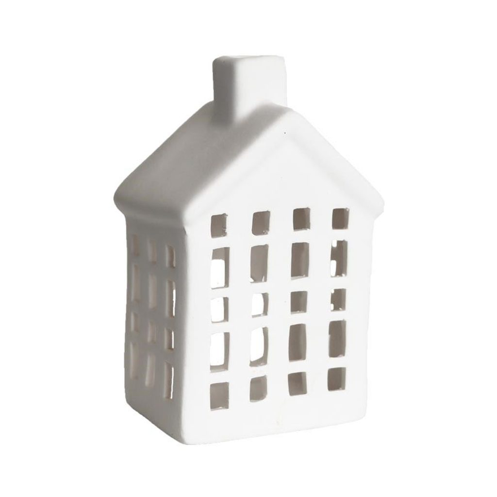 Dekorační domek na svíčku. Rozměry : 6,8 × 5,1 cm, výška 10,6 cm. Barva : bílá. Materiál : keramika.