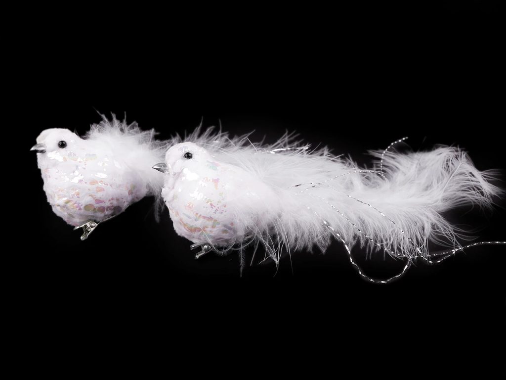 Dekorační ptáček působí něžně a romanticky. Tělo má pokryté jemným plyšem a najdete na něm i odlesky s AB efektem. Zespodu má připevněnou kovovou sponu, díky které můžete ptáčka připevnit například na věnec, větvičku, záclonu či ho naaranžovat do květinových vazeb.