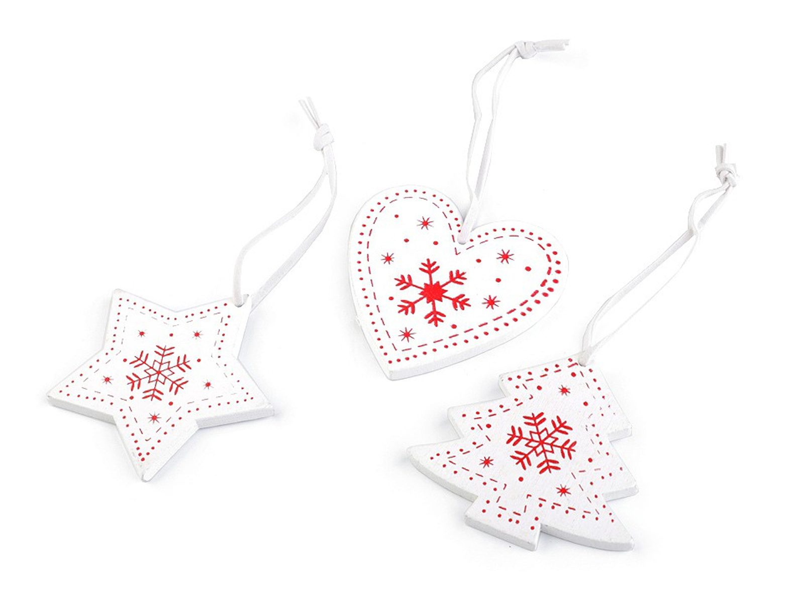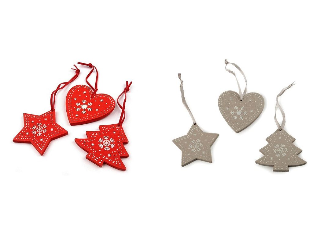 Dřevěné vánoční dekorace ve tvaru hvězdy, srdce a stromku mají malovaný povrch. Díky připevněnému poutku z eko kůže je můžete pověsit na stromek, na dveře, do oken nebo volně do prostoru.