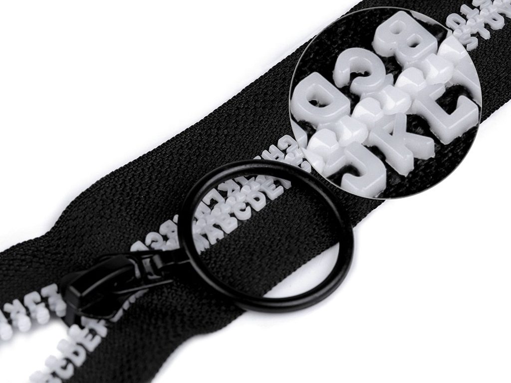 Kostěný zip lemují podél zoubků písmenka abecedy. Je vhodný k našití na bundy, mikiny, vesty apod. Taháček na jezdci je kulatý.