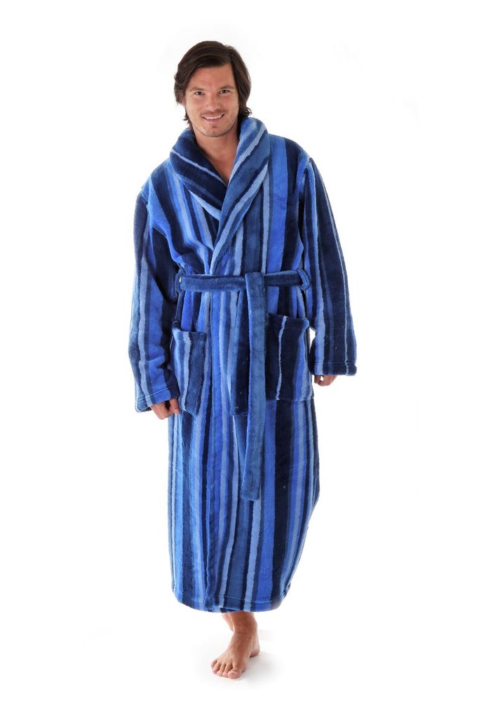 Moderní hřejivý pánský župan plný proužků v odstínech modré barvy. Župan se šálovým límcem Joe je vyroben z huňatého a teplého materiálu. Župan se šálovým límcem, kapsami a zavazováním v pase.